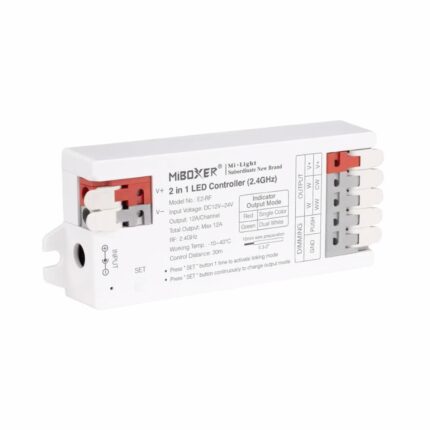 Der MiBoxer E2-RF ist ein leistungsstarker 2-in-1 LED-Controller für MONO und CCT LED-Streifen der durch seine werkzeuglosen Anschlussklemmen besonders einfach zu installieren ist. Dank der cleveren Push-Klemmen lässt sich der Controller in wenigen Sekunden anschließen – ganz ohne Schraubenzieher oder Spezialwerkzeug.