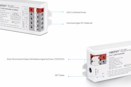 - 2-in-1 Allrounder für LED-Streifen: Ob MONO oder CCT – der E2-RF beherrscht alle gängigen Varianten. So bleiben Sie flexibel für jede Beleuchtungsidee.