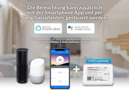 - Flexible Steuerung & Smart-Home-Integration: Wählen Sie zwischen RF-Fernbedienung, App* oder Sprachsteuerung*. Szenen, Timer und Gruppenschaltungen machen Ihr Lichtkonzept noch komfortabler.