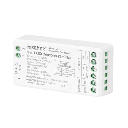 Mit dem MiBoxer FUT035S+ gestalten Sie Ihre Beleuchtung so flexibel wie nie zuvor: Der 2-in-1 LED-Controller steuert MONO- und CCT-Streifen zuverlässig über 2,4 GHz Funk und bietet stufenloses Dimmen sowie brillante Weißtöne. Ob bequem per Fernbedienung oder intuitiv über die Tuya Smart App* – genießen Sie volle Kontrolle und setzen in Wohn-, Büro- oder Shop-Bereichen eindrucksvolle Lichtakzente.