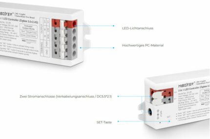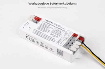Ein Controller, zwei LED-Modi (MONO , CCT) und zwei Funkstandards (Zigbee 3.0 + 2,4 GHz RF) – damit steuern Sie jeden LED-Strip flexibel: ob kalt- oder warmweiß, bequem per App, Sprachbefehl oder Fernbedienung. Die cleveren Push-Klemmen machen die Montage kinderleicht und ermöglichen den Anschluss in Sekunden – ganz ohne Schraubenzieher. So vereint der E2-ZR maximale Vielseitigkeit, einfache Installation und moderne Smart-Home-Technologie in einem Gerät.