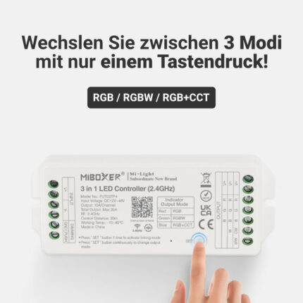 - Fünf Modi – ein Controller: MONO, CCT, RGB, RGBW oder RGB+CCT: Mit nur einem Gerät steuern Sie alle gängigen LED-Streifen. Einfach per Modus-Knopf umschalten – ohne zusätzlichen Controller.