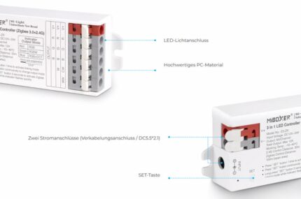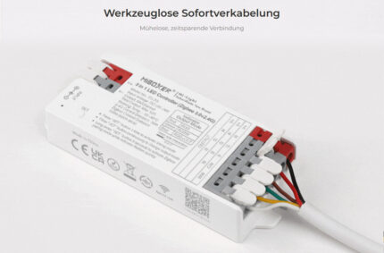 Ein Controller, drei LED-Modi (RGB, RGBW, RGB+CCT) und zwei Funkstandards (Zigbee 3.0 + 2,4 GHz RF) – damit steuern Sie jeden LED-Strip flexibel: ob bunt, kalt- oder warmweiß, bequem per App, Sprachbefehl oder Fernbedienung. Die cleveren Push-Klemmen machen die Montage kinderleicht und ermöglichen den Anschluss in Sekunden – ganz ohne Schraubenzieher. So vereint der E3-ZR maximale Vielseitigkeit, einfache Installation und moderne Smart-Home-Technologie in einem Gerät.