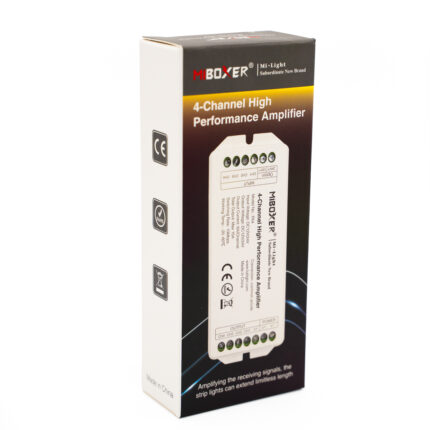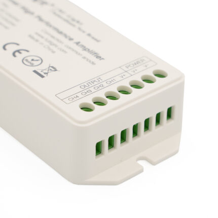 Dieser 4 Kanal Verstärker verbessert das Steuersignal bei RGBW LED-Stripes. Amplifier werden gerne eingesetzt, wenn mehrere Streifen verbunden und zur selben Zeit gesteuert werden sollen. Damit kann ein Einsatz von mehreren Steuergeräten vermieden werden.