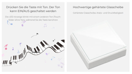 - Elegantes Touch-Glas-Design mit Magnethalterung: Das flache 86 × 86 × 16 mm Panel hat eine kratzfeste Glasoberfläche und lässt sich entweder fest montieren oder magnetisch abnehmen und als Hand-Fernbedienung nutzen.