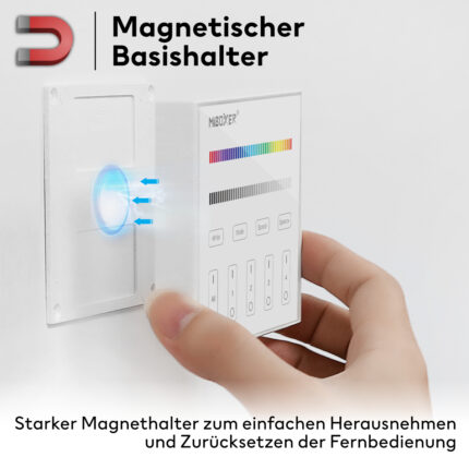 Dank magnetischer Halterung ist das Panel im Handumdrehen mobil oder fest installiert. Und mit dem extrem niedrigen Standby-Verbrauch haben Sie eine wartungsarme Lösung, die Sie überzeugen wird. Ob Wohnung, Büro oder Hotelanlage – mit dieser Fernbedienung setzen Sie Lichtprojekte um, die Design, Funktion und Technik in perfekter Balance bringen.