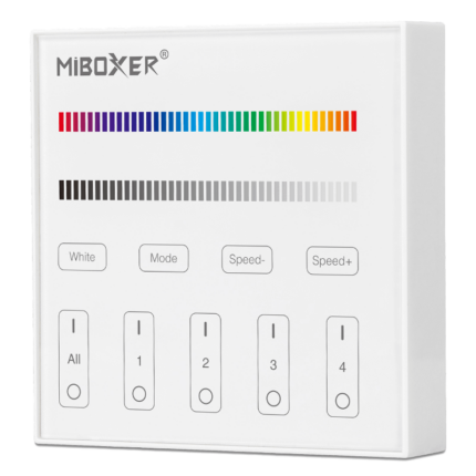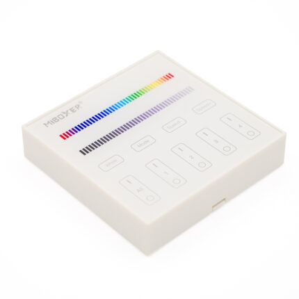 Die intelligenten Panel-Controller von Mi-Light sind wahre High-End Controller mit TouchScreen. Das TouchScreen ist besonders Kratzfest. Das batteriebetrieben Panel für bunte RGBW LED-Streifen wird für folgende Funktionen genutzt: Dimmer, Ein/Aus Schalter, Farbtemperaturwechsel, Farbwechsel und einstellen der Farbsättigung. Das Panel kann bis zu 4 Zonen separat bedienen.