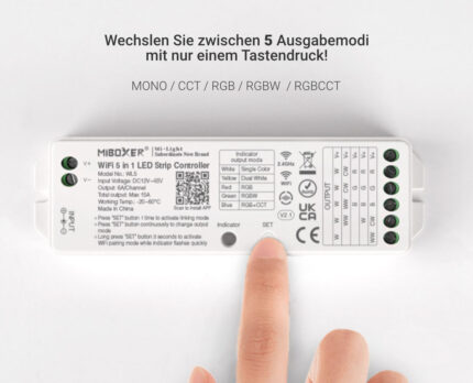Der MiBoxer WL5 überzeugt mit seiner 5-in-1 Funktion und bietet dank WLAN, 2,4 GHz Funk, Bluetooth, App- und Sprachsteuerung maximale Flexibilität.