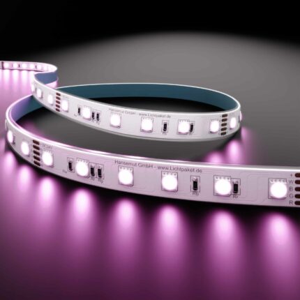 Unser leistungsstarker, dichtbesetzter und flexibler LED-Streifen überzeugt durch ein neutrales Warmweiß und lebendige Farben in Rot, Grün und Blau, stets mit hervorragender Farbwiedergabe. Mit 60 LEDs pro Meter sorgt dieser LED-Streifen für eine besonders gleichmäßige Ausleuchtung.