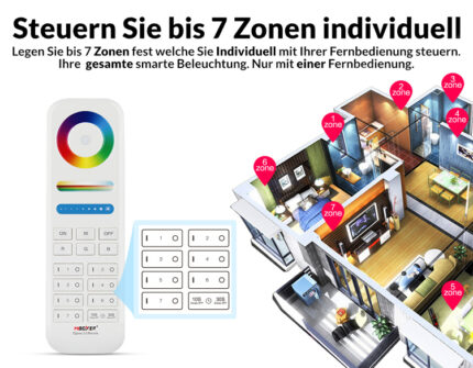 Die MiBoxer FUT089Z überzeugt durch ihre intelligente 7-Zonen-Steuerung in Kombination mit Zigbee 3.0-Technologie. Steuern Sie einzelne oder mehrere Lichtbereiche – von indirekten Aluprofil-Leuchten bis zur Hauptbeleuchtung – schnell, präzise und kabellos vernetzt. Eine Fernbedienung, die große Lichtinstallationen einfach und effizient beherrschbar macht.