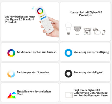 Dank des Zigbee 3.0-Standards ist die Fernbedienung kompatibel mit bekannten Smart-Home-Systemen wie Philips Hue, Amazon Alexa oder Tuya und bietet dabei eine stabile, verzögerungsfreie Signalübertragung.