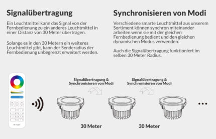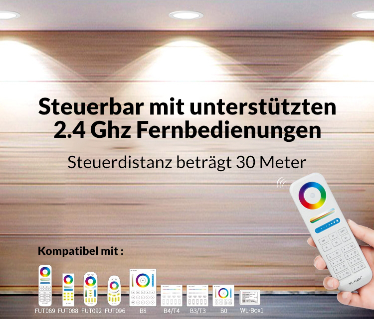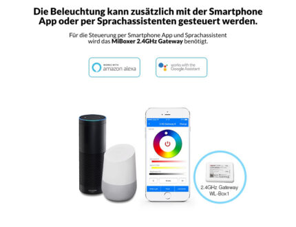 Mit einer passenden Fernbedienung können Sie den Strahler dimmen, die Farbtemperatur wechseln und die Sättigung sowie die Farben einstellen. Mit Hilfe der WL-Box1 können Sie die Lampe nicht nur per Fernbedienung steuern, sondern auch über die App oder per Sprachsteuerung (z.B. Alexa und Google Home). Der Vorteil dieser Einbaustrahler ist, dass diese nicht nur Signale empfangen, sondern auch weitergeben können. Somit lassen sich mehrere Lampen dieser Art über größere Entfernung steuern, ohne dass ein Signalverstärker notwendig ist. Ein entsprechendes Netzteil mit einer Eingangsspannung von 100 bis 240 Volt ist bereits in dem Gerät integriert. Daher können Sie das gerät einfach in Ihren Stromanschluss integrieren.