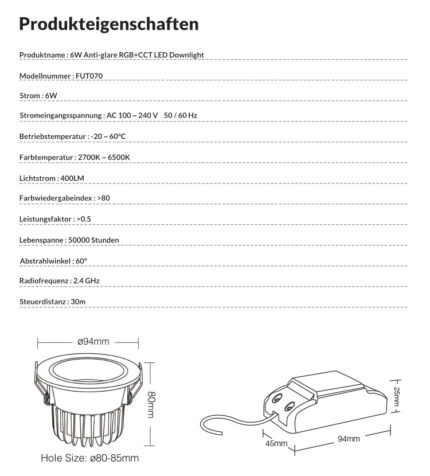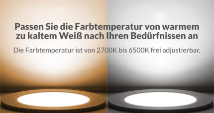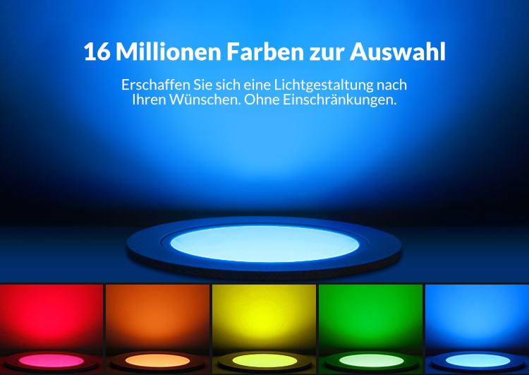 Der kleine 6W RGB + CCT LED-Einbaustrahler leuchtet in den Farben ihrer Wahl. Sie können kräftige bunte Farben generieren oder einen weißen geschmackvollen Farbton. Die Weißtöne können innerhalb der Farbtemperaturen von 2700 bis 6500 Kelvin gewechselt werden. Somit ist es möglich einen angehemen warmweißen Farbton zu erhalten. Aber auch ein kaltweißer Farbton z.B. als Arbeitslicht ist möglich.