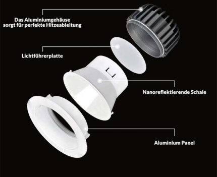 Durch das robuste Aluminiumgehäuse ist der Strahler gut geschützt und wird ausreichend gekühlt. Das sorgt für eine lange Lebensdauer. Zum leichten Einbau sind rostfreie Stahlfedern angebracht. Durch den modernen Synchronisationsmodus lassen sich leichte Farbabweichungen mehrerer Geräte ausgleichen. Dieses LED-Downlight hat keine UV- oder IR-Strahlung. Die Installation und Steuerung ist in mehreren Gruppen möglich.Die eingebaute Blendschutzlinse sorgt für ein angenehmes Licht.