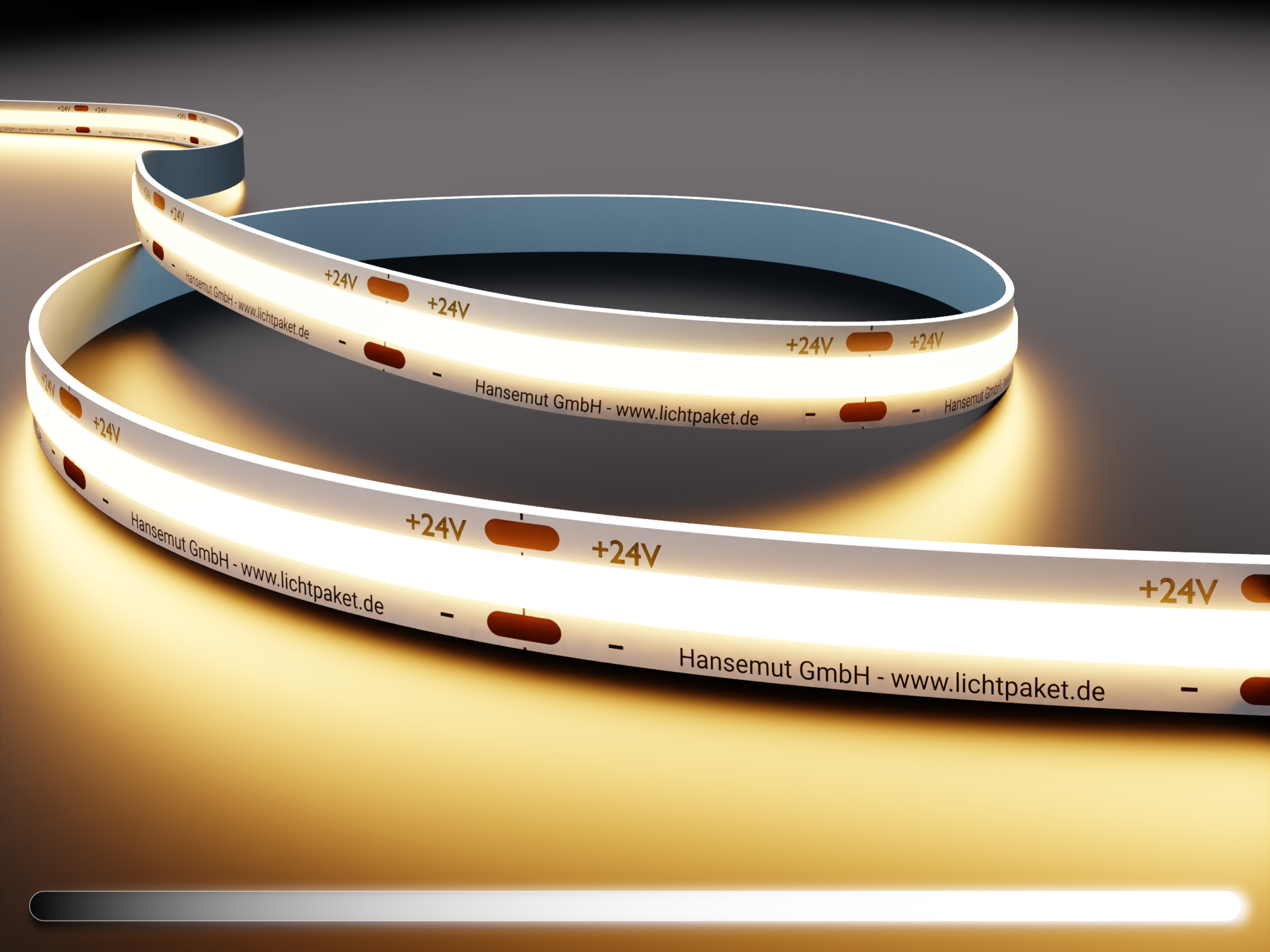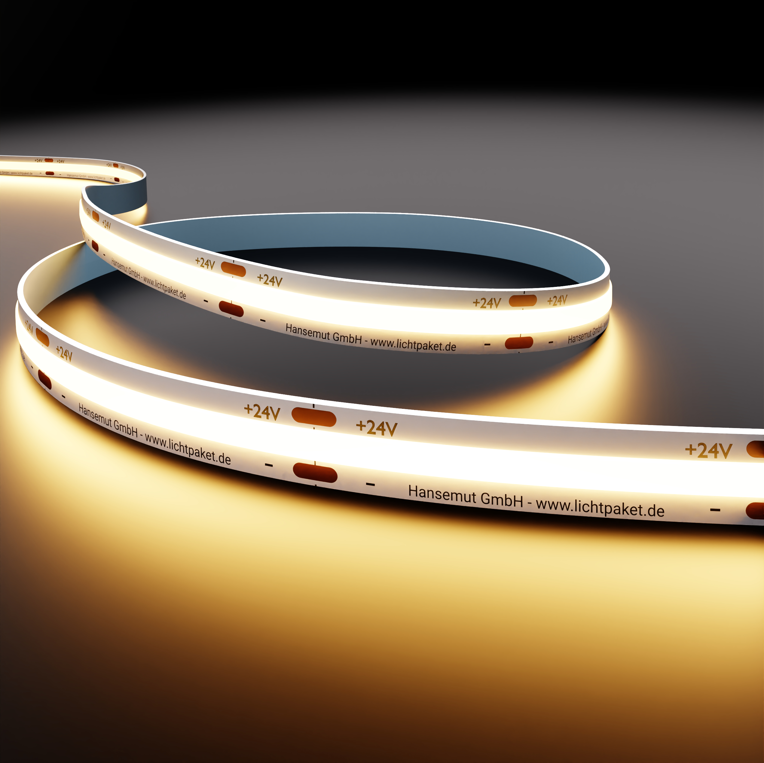 Dieser leistungsstarke, dichtbesetzte, flexible COB LED-Streifen zeichnet sich durch sein behagliches Warmweiss bei guter Farbwiedergabe aus.