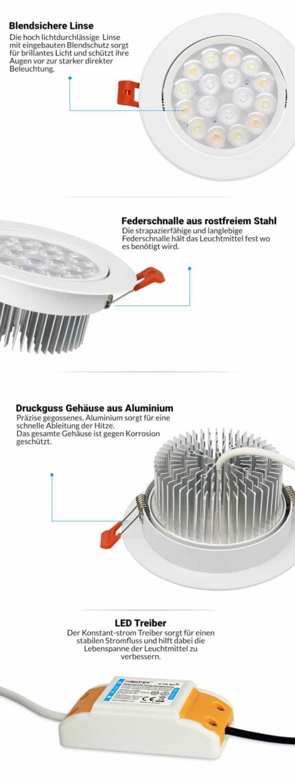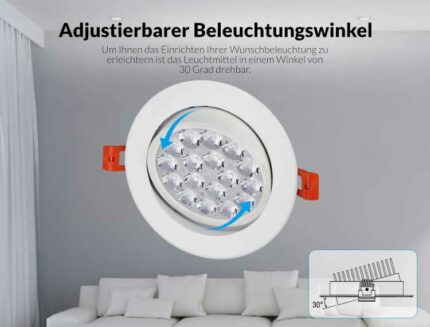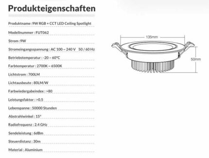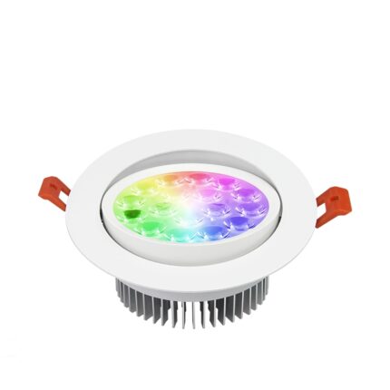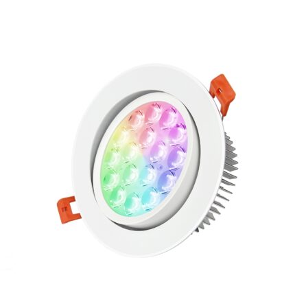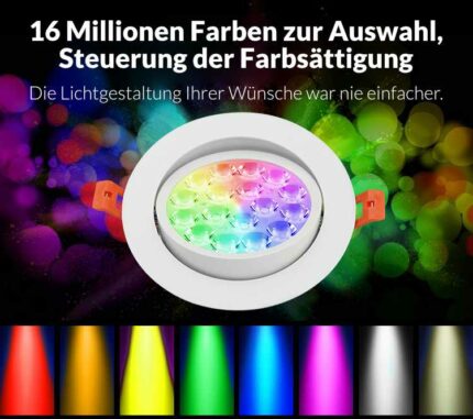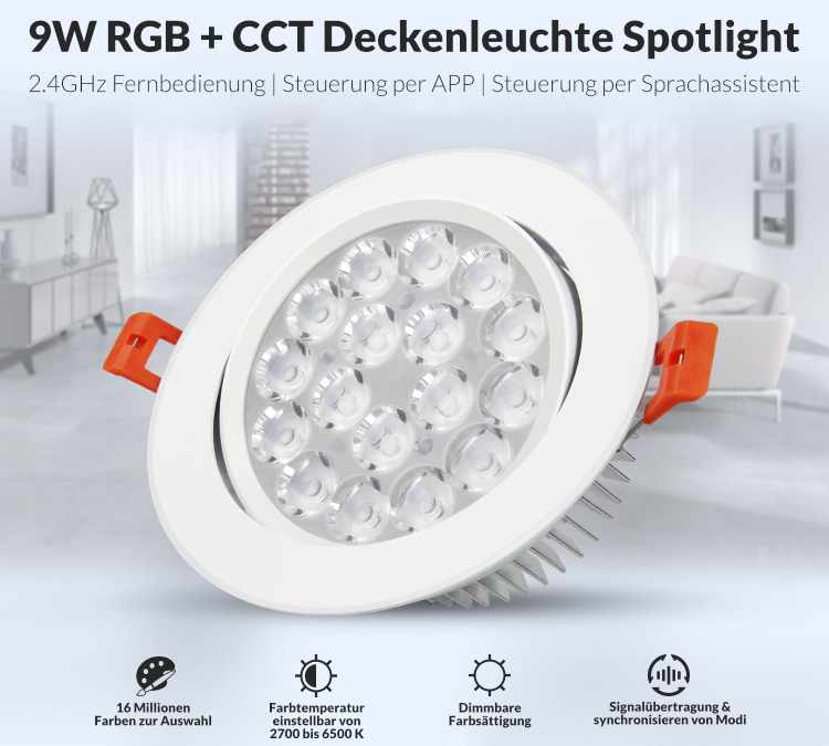 Die 9W RGB + CCT LED-Deckenleuchte strahlt in den Farben ihrer Wahl. Sie können kräftige bunte Farben generieren oder einen weißen geschmackvollen Farbton. Die Weißtöne können innerhalb der Farbtemperaturen von 2700 bis 6500 Kelvin gewechselt werden. Somit ist es möglich einen angehemen warmweißen Farbton zu erhalten. Aber auch ein kaltweißer Farbton z.B. als Arbeitslicht ist möglich. Der Drehwinkel des Lichtstrahls lässt sich um 30 Grad drehen. Durch die Blendschutzlinsen erscheint das Licht sehr weich und angenehm trotz hoher Lichtintensität.