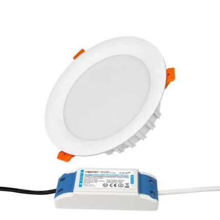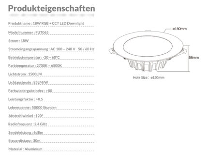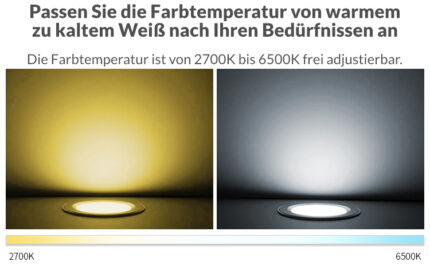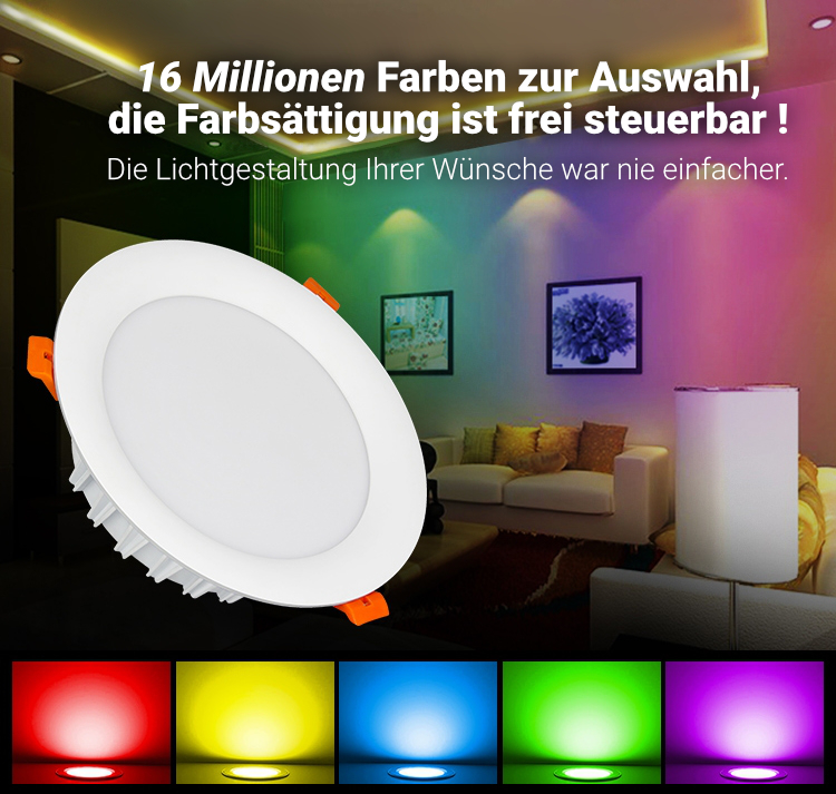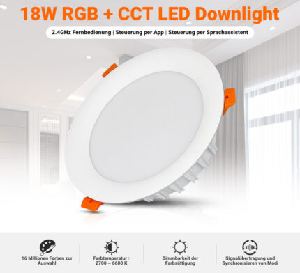 Der runde 18W RGB + CCT LED-Einbaustrahler leuchtet in den Farben ihrer Wahl. Sie können kräftige bunte Farben generieren oder einen weißen geschmackvollen Farbton. Die Weißtöne können innerhalb der Farbtemperaturen von 2700 bis 6500 Kelvin gewechselt werden. Somit ist es möglich einen angehemen warmweißen Farbton zu erhalten. Aber auch ein kaltweißer Farbton z.B. als Arbeitslicht ist möglich.