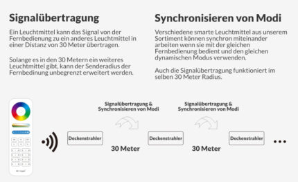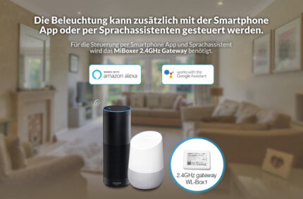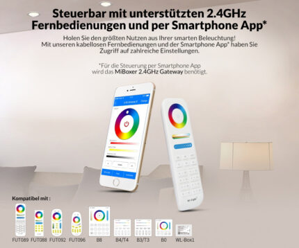 Mit einer passenden Fernbedienung können Sie den Strahler dimmen, die Farbtemperatur wechseln und die Sättigung sowie die Farben einstellen. Mit Hilfe der WL-Box1 können Sie die Lampe nicht nur per Fernbedienung steuern, sondern auch über die App oder per Sprachsteuerung (z.B. Alexa und Google Home). Der Vorteil dieser Einbaustrahler ist, dass diese nicht nur Signale empfangen, sondern auch weitergeben können. Somit lassen sich mehrere Lampen dieser Art über größere Entfernung steuern, ohne dass ein Signalverstärker notwendig ist. Ein entsprechendes Netzteil mit einer Eingangsspannung von 100 bis 240 Volt ist bereits in dem Gerät integriert. Daher können Sie das gerät einfach in Ihren Stromanschluss integrieren.