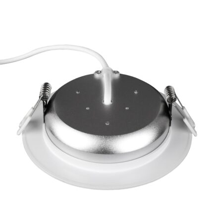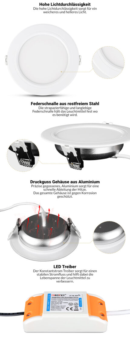 Durch das robuste Aluminiumgehäuse ist der Strahler gut geschützt und wird ausreichend gekühlt. Das sorgt für eine lange Lebensdauer. Zum leichten Einbau sind rostfreie Stahlfedern angebracht. Durch den modernen Synchronisationsmodus lassen sich leichte Farbabweichungen mehrerer Geräte ausgleichen. Dieses LED-Downlight hat keine UV- oder IR-Strahlung. Die Installation und Steuerung ist in mehreren Gruppen möglich.