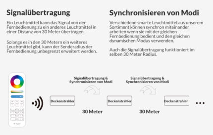 Mit einer passenden Fernbedienung können Sie den Strahler dimmen, die Farbtemperatur wechseln und die Sättigung sowie die Farben einstellen. Mit Hilfe der WL-Box1 können Sie die Lampe nicht nur per Fernbedienung steuern, sondern auch über die App oder per Sprachsteuerung (z.B. Alexa und Google Home). Der Vorteil dieser Einbaustrahler ist, dass diese nicht nur Signale empfangen, sondern auch weitergeben können. Somit lassen sich mehrere Lampen dieser Art über größere Entfernung steuern, ohne dass ein Signalverstärker notwendig ist. Ein entsprechendes Netzteil mit einer Eingangsspannung von 100 bis 240 Volt ist bereits in dem Gerät integriert. Daher können Sie das gerät einfach in Ihren Stromanschluss integrieren.
