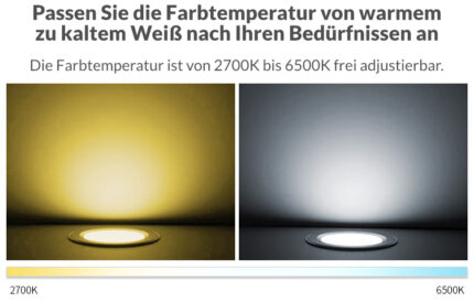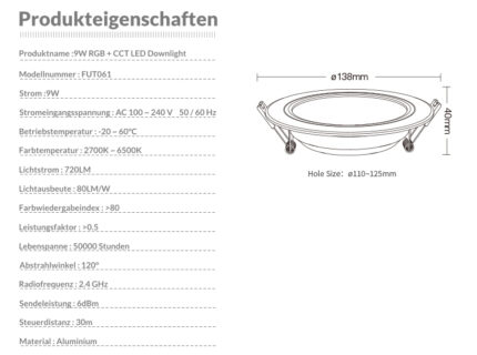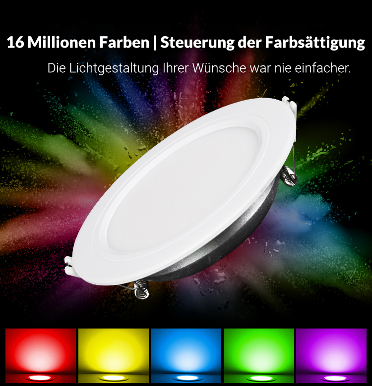 Der runde 9W RGB + CCT LED-Einbaustrahler leuchtet in den Farben ihrer Wahl. Sie können kräftige bunte Farben generieren oder einen weißen geschmackvollen Farbton. Die Weißtöne können innerhalb der Farbtemperaturen von 2700 bis 6500 Kelvin gewechselt werden. Somit ist es möglich einen angehemen warmweißen Farbton zu erhalten. Aber auch ein kaltweißer Farbton z.B. als Arbeitslicht ist möglich.