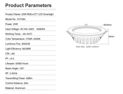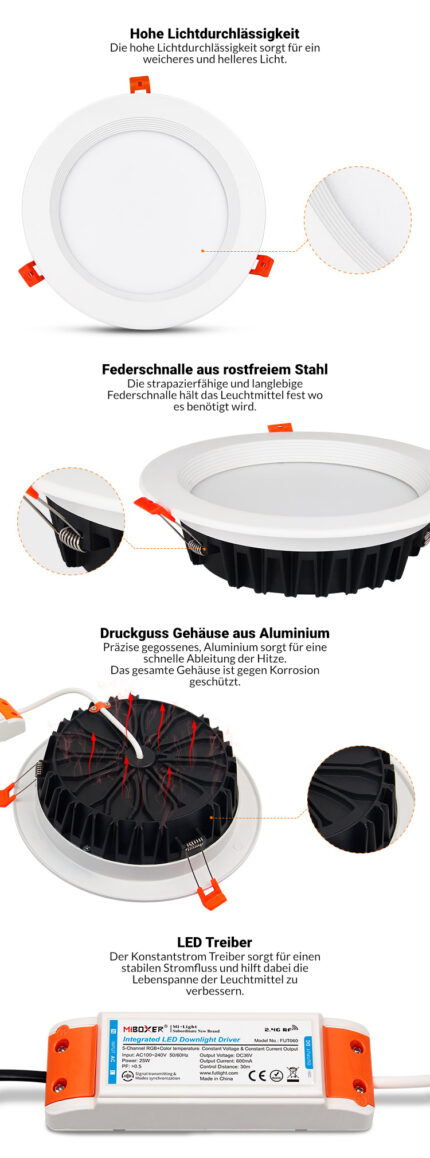 Durch das robuste Aluminiumgehäuse ist der Strahler gut geschützt und wird ausreichend gekühlt. Das sorgt für eine lange Lebensdauer. Zum leichten Einbau sind rostfreie Stahlfedern angebracht. Durch den modernen Synchronisationsmodus lassen sich leichte Farbabweichungen mehrerer Geräte ausgleichen. Dieses LED-Downlight hat keine UV- oder IR-Strahlung. Die Installation und Steuerung ist in mehreren Gruppen möglich.
