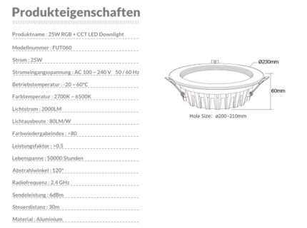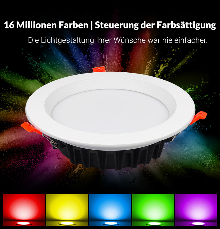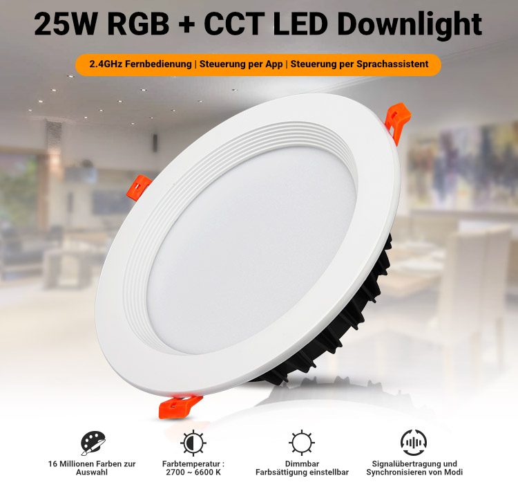 Der runde 25W RGB + CCT LED-Einbaustrahler leuchtet in den Farben ihrer Wahl. Sie können kräftige bunte Farben generieren oder einen weißen geschmackvollen Farbton. Die Weißtöne können innerhalb der Farbtemperaturen von 2700 bis 6500 Kelvin gewechselt werden. Somit ist es möglich einen angehemen warmweißen Farbton zu erhalten. Aber auch ein kaltweißer Farbton z.B. als Arbeitslicht ist möglich.