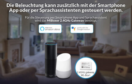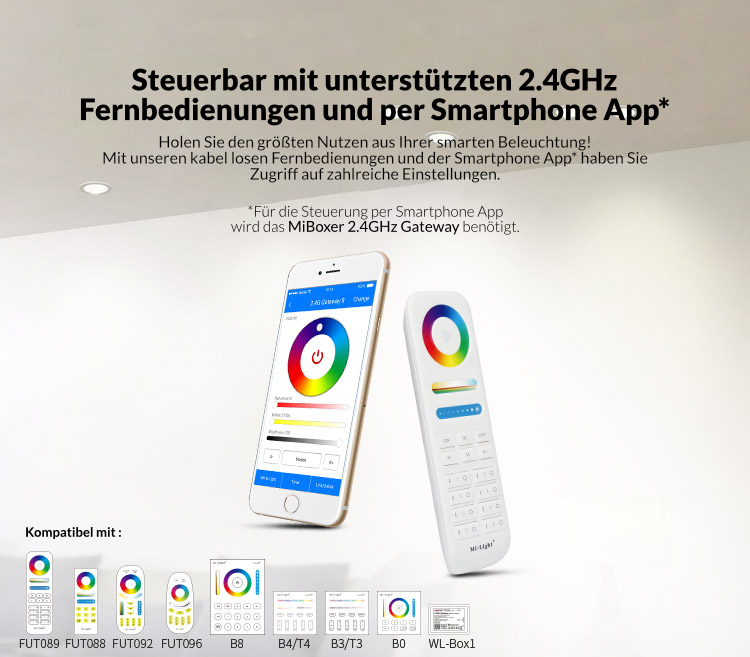 Mit einer passenden Fernbedienung können Sie den Strahler dimmen, die Farbtemperatur wechseln und die Sättigung sowie die Farben einstellen. Mit Hilfe der WL-Box1 können Sie die Lampe nicht nur per Fernbedienung steuern, sondern auch über die App oder per Sprachsteuerung (z.B. Alexa und Google Home). Der Vorteil dieser Einbaustrahler ist, dass diese nicht nur Signale empfangen, sondern auch weitergeben können. Somit lassen sich mehrere Lampen dieser Art über größere Entfernung steuern, ohne dass ein Signalverstärker notwendig ist. Ein entsprechendes Netzteil mit einer Eingangsspannung von 100 bis 240 Volt ist bereits in dem Gerät integriert. Daher können Sie das gerät einfach in Ihren Stromanschluss integrieren.