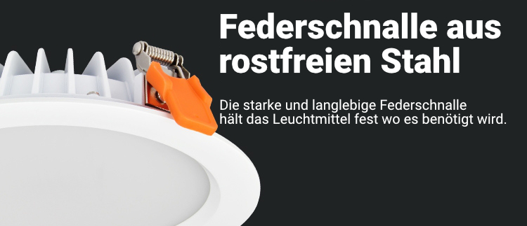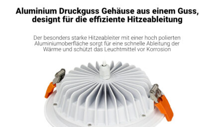 Durch das robuste Aluminiumgehäuse ist der Strahler gut geschützt und wird ausreichend gekühlt. Das sorgt für eine lange Lebensdauer. Zum leichten Einbau sind rostfreie Stahlfedern angebracht. Durch die Blenschutzlinse und die spezielle Abdeckung wirkt das kräftige Licht deutlich weicher.