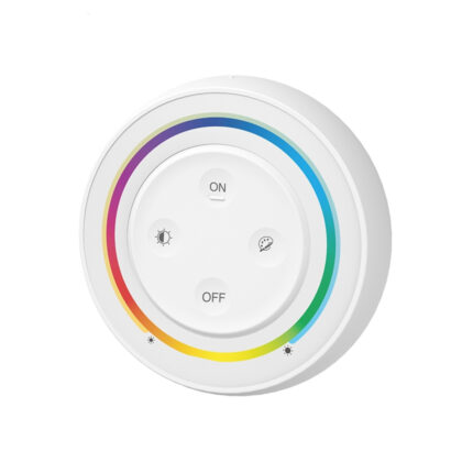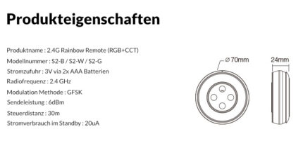 Der S2 arbeitet über 2,4 GHz Funk mit bis zu 30 m Reichweite und verbindet so maximalen Komfort mit zuverlässiger Steuerung. Der energiearme Standbyverbrauch (< 20 µA) sorgt für langanhaltende Batterieleistung – betrieben durch zwei AAA-Batterien. Die Steuerung umfasst Dimmen, Farbauswahl (RGB) und Farbtemperatur (CCT) in einem Gerät. Das schlanke Design (Ø 70 mm x 24 mm) ist wahlweise in Schwarz oder Weiß erhältlich und passt sich stilvoll jeder Innenraumgestaltung an.