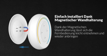 Die Wandfernbedienung lässt sich problemlos an Ihrer bevorzugten Stelle anbringen und fügt sich nahtlos in Ihr vorhandenes Raumdesign ein. Die Bedienung ist kinderleicht: Wählen Sie einfach den gewünschten Lichtmodus, und die Fernbedienung erledigt den Rest. Darüber hinaus kann die Fernbedienung leicht vom Magnethalter abgenommen und als Handfernbedienung verwendet werden.
