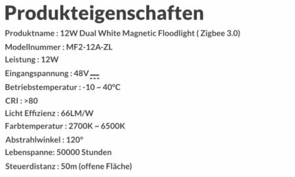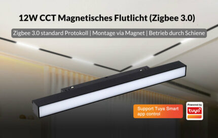 Das 12-Watt-Flutlicht von Miboxer ist für das Schienensystem AMMR20S15B, AMMR20P15B und AMMR20F15B geeignet. Es wird per Magnetismus in die Schiene eingesetzt und kann dann frei bewegt werden. Mit 735 Lumen kann die Lampe bestimmte Bereiche mit wenig Energieverbrauch vollständig ausleuchten. Das Licht kann von 2700 Kelvin (Warmweiß) bis 6500 Kelvin (Kaltweiß) reguliert werden. Mit Hilfe der ZB-Box kann das Flutlicht durch eine Fernbedienung oder die Tuya-App in Kombination mit der ZB-Box 2 gesteuert werden. Die Farbtemperatur und die Helligkeit (Dimmfunktion) können verändert werden.