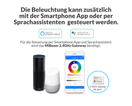 * Für die Sprachsteuerung und die Steuerung per App wird ein 2,4 GHz Gateway von MiBoxer wie WL-BOX2 ( bei uns im Shop erhältlich ) benötigt.