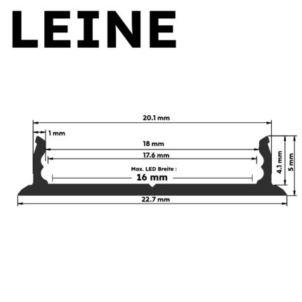 QuerschnittDas Aluminiumprofil ist mit allen Arten von LED-Streifen bis zu einer Breite von 16 mm kompatibel. LEINE ist durch seine geringe Höhe von 5 mm vielseitig und flexibel einsetzbar. Merkmale :