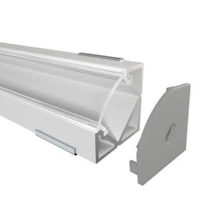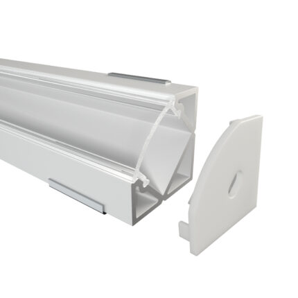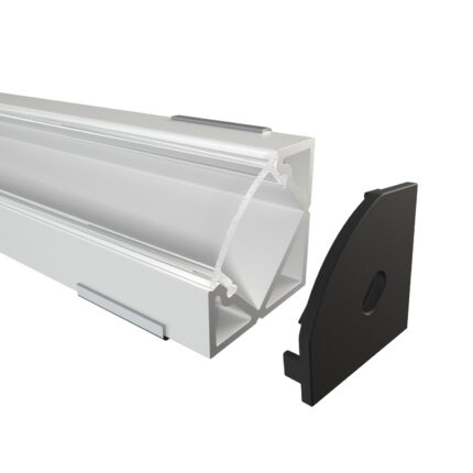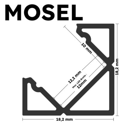 Das Eckprofil MOSEL aus Aluminium ist in drei Farben erhältlich: Eloxiert, Weiß und Schwarz. Es ist perfekt für LED-Streifen bis 12 mm geeignet. Mit 18,2 mm Breite, 18,2 mm Höhe und Längen bis zu 300 cm ( 301 cm – 600 cm auf Anfrage ) eignet es sich ideal für hochwertige Installationen. Die Abdeckungen aus Polycarbonat sind in vier Varianten verfügbar: Schwarz mit 50 % Lichtdurchlässigkeit, Opal mit 67 % Lichtdurchlässigkeit, Semi mit 85 % Lichtdurchlässigkeit und Klar mit 95 % Lichtdurchlässigkeit. Zusätzlich runden Endkappen aus ABS-Plastik das Profil ab – die perfekte Wahl für moderne Beleuchtungslösungen.