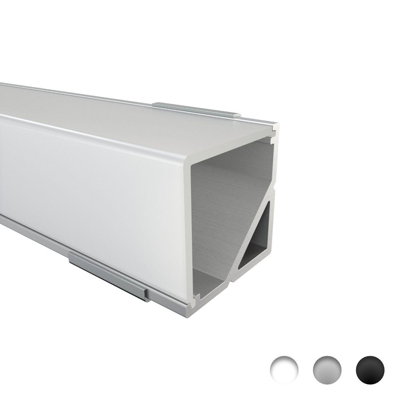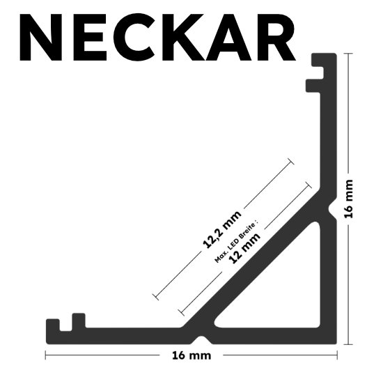 Das Eckprofil NECKAR aus Aluminium ist in drei Farben erhältlich: Eloxiert, Weiß und Schwarz. Es ist perfekt für LED-Streifen bis 12 mm geeignet. Mit 16 mm Breite, 16 mm Höhe und Längen bis zu 300 cm ( 301 cm – 600 cm auf Anfrage ) eignet es sich ideal für hochwertige Installationen. Die Abdeckungen aus Polycarbonat sind in vier Varianten verfügbar: Schwarz mit 50 % Lichtdurchlässigkeit, Opal mit 67 % Lichtdurchlässigkeit, Semi mit 85 % Lichtdurchlässigkeit und Klar mit 95 % Lichtdurchlässigkeit. Zusätzlich runden Endkappen aus ABS-Plastik das Profil ab – die perfekte Wahl für moderne Beleuchtungslösungen.