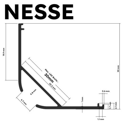 QuerschnittDas Aluminiumprofil ist mit allen Arten von LED-Streifen bis zu einer Breite von 20 mm kompatibel. NESSE ist durch seine besondere Bauhöhe auch perfekt für sehr breite und hohe LED-Streifen geeignet. Merkmale :