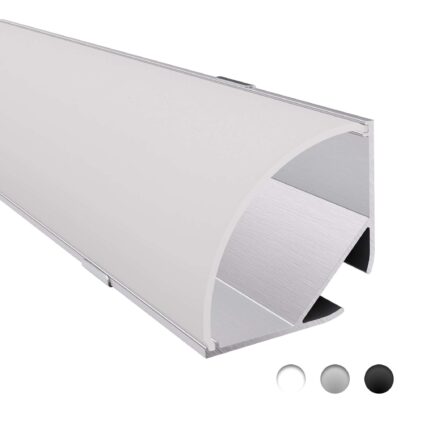 Das Eckprofil NESSE aus Aluminium ist in drei Farben erhältlich: Eloxiert, Weiß und Schwarz. Es ist perfekt für LED-Streifen bis 20 mm geeignet. Mit 30 mm Breite, 30 mm Höhe und Längen bis zu 300 cm ( 301 cm – 600 cm auf Anfrage ) eignet es sich ideal für hochwertige Installationen mit besonders breiten oder hohen LED-Streifen. Die Abdeckungen aus Polycarbonat sind in vier Varianten verfügbar: Schwarz mit 50 % Lichtdurchlässigkeit, Opal mit 67 % Lichtdurchlässigkeit, Semi mit 85 % Lichtdurchlässigkeit und Klar mit 95 % Lichtdurchlässigkeit. Zusätzlich runden Endkappen aus ABS-Plastik das Profil ab – die perfekte Wahl für moderne Beleuchtungslösungen.