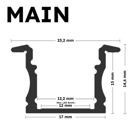 QuerschnittDas Aluminiumprofil ist mit allen Arten von LED-Streifen bis zu einer Breite von 12 mm kompatibel. Das Einbauprofil MAIN ist vielseitig und flexibel einsetzbar. Merkmale :