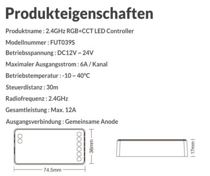 In Kombination mit einer WL-Box1 kann dieser Controller auch per Sprachsteuerung oder App genutzt werden. Mit der App stehen noch viele weitere Funktionen zur Verfügung. Der Controller dient gleichzeitig als Signalverstärker mit einer Reichweite von 30m. Wenn Sie in ausreichendem Abstand mehrere Controller im Einsatz haben, können Sie somit auf einen separaten Verstärker verzichten. Damit lassen sich auch größere Distanzen überbrücken. Dieser Controller kann Einfarbige, RGBW, RGB und CCT-Streifen steuern.