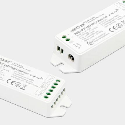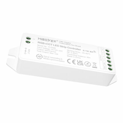 Dieses Steuergerät wird zum Farbwechsel und Dimmen von RGB+CCT-Stripes genutzt. Mit diesem Controller kann man bis zu 4 LED-Gruppen steuern. Eine Beleuchtung mehrerer LED-Streifen ist durch die 4-Kanal-Steuerung also möglich, sogar zur gleichen Zeit. Eine Steuerung per Fernbedienung und Wandschalter ist möglich. Mit dem entsprechenden Gateway kann der Controller auch per App oder Sprachsteuerung genutzt werden.