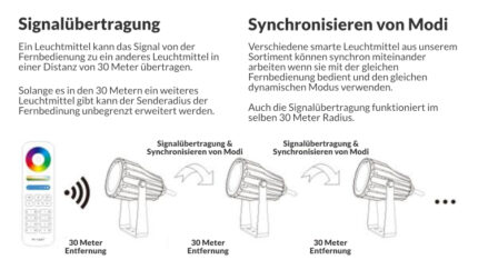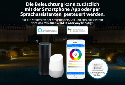 Die Steuerung erfolgt bequem über das MiBoxer 2.4GHz Funksystem. Mit passenden Fernbedienungen oder einem Smart Gateway lassen sich mehrere Leuchten gemeinsam steuern, Szenen erstellen und Zeitpläne festlegen. Bei Einbindung über das Gateway ist auch die Sprachsteuerung via Alexa oder Google Assistant möglich.