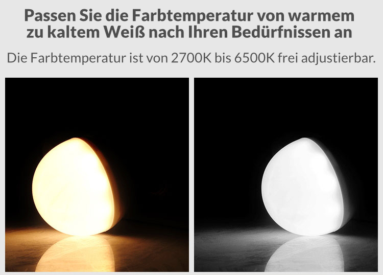 Diese 6 Watt Glühbirne kann die Lichtfarbe stufenlos zwischen Warmweiss und kaltweiss wechseln. Ein gemütliches Stimmungslicht erscheint bei einer Farbtemperatur von 2700 Kelvin.