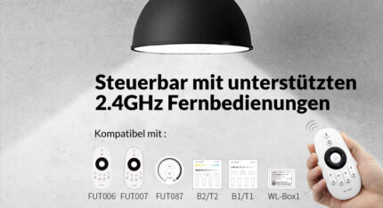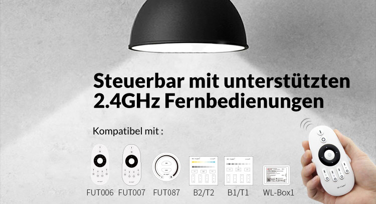 Neben dem Wechsel der Farbtemperatur kann die Lampe mit einer entsprechenden Fernbedienung auch gedimmt werden. Die Steuerung erfolgt über eine 2,4 GHz Funkfernbedienung.