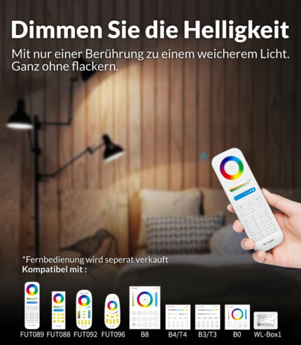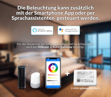 * Für die Sprachsteuerung und die Steuerung per App wird ein 2,4 GHz Gateway von MiBoxer wie WL-BOX2 ( bei uns im Shop erhältlich ) benötigt.