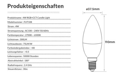 | Produktname: | 4W RGB+CCT E14 Kerzenlicht (2,4 GHz) |