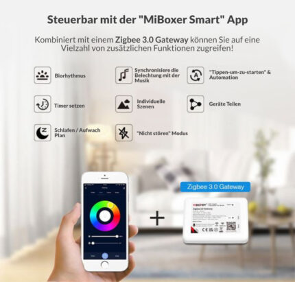* Für die Sprachsteuerung und die Steuerung per App wird ein ZigBee 3.0 Gateway von MiBoxer wie ZB-BOX3 ( bei uns im Shop erhältlich ) benötigt.