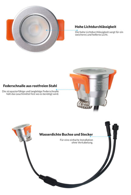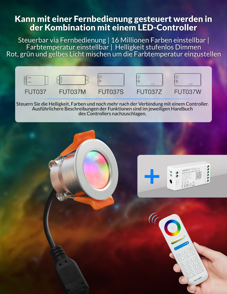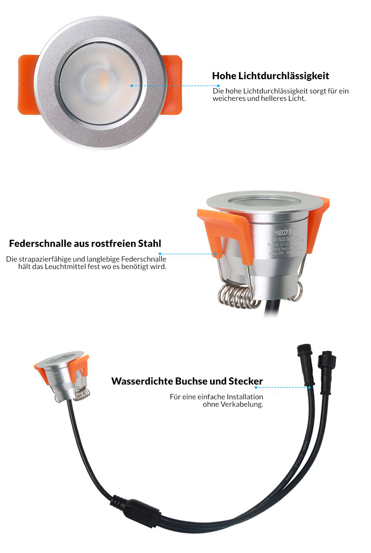Der Helligkeit des LED-Spots wird mit Hilfe einer Funkfernbedienung gesteuert (Dimmen). Je nach Wahl des Controllers können die Einbaustrahler auch über Zigbee gesteuert werden. Zur Befestigung sind rostfreie Metallfedern vorhanden. Der Deckenausschnitt sollte im Bereich von 33 – 36 mm liegen, um den wartungsarmen Spot optimal zu platzieren.