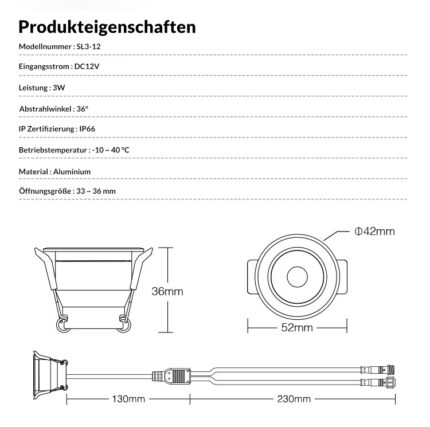 Durch das gefertigte Aluminiumgehäuse hat die Lampe eine ideale Wärmeableitung, so dass die Lebensdauer bis zu 50.000 h beträgt. Durch die spezielle Abdeckung wirkt das Licht sehr weich und angenehm. Diese Einbaustrahler können in einer Sauna von bis zu 60°C betrieben werden. Stellen Sie sicher, dass die 60°C nicht überschritten werden.