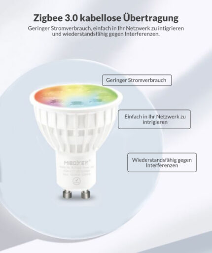 Der FUT103z LED-Spot ist Zigbee-3.0-kompatibel und lässt sich nahtlos in Zigbee-basierte Smart-Home-Systeme integrieren. Er kombiniert die klassische GU10-Installation mit smarter Lichtsteuerung und ermöglicht die flexible Regelung von Farben und Weißtönen (RGB + CCT). In Verbindung mit einem Zigbee-Gateway von MiBoxer ist der Spot per TuyaSmart-App sowie per Sprachsteuerung über Amazon Alexa, Google Assistant und IKEA Smart Home steuerbar.